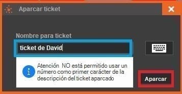 Una vez hemos seleccionado la opción de reservar ticket nos aparecerá una ventana que nos solicitará un nombre identificativo para el ticket a reservar. (Remarcado en un recuadro Azul).