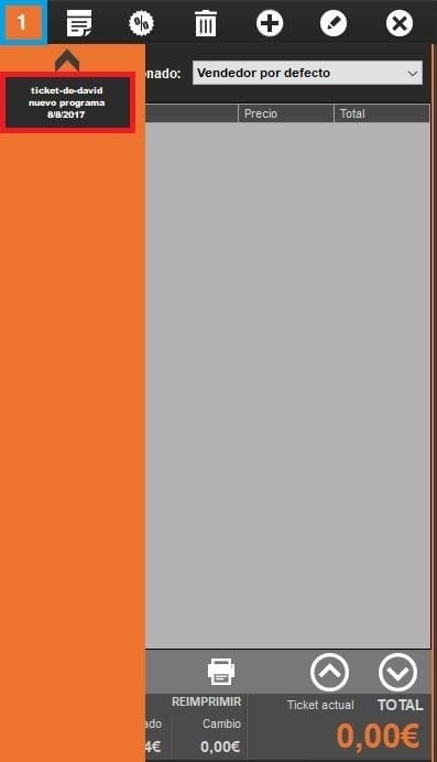 Posteriormente vuelve nuestro cliente para terminar su compra, por lo que debemos retirar su ticket de los tickets reservados. Así que para recuperar un ticket aparcado, haz click en la banderita numerada y de color naranja que aparece justo en la parte superior izquierda de la pantalla.