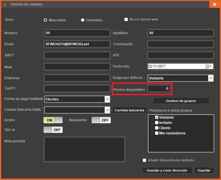Si deseamos modificar los puntos que posee un cliente manualmente, debemos ir a la edición de clientes, una vez en el menú de edición de clientes modificar el valor de sus puntos (Remarcado con un recuadro Rojo):