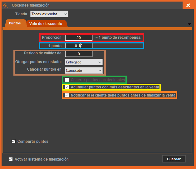 En esta opción (Remarcada con un recuadro Amarillo) designaremos si un cliente recibe puntos en una compra en la que está utilizando un vale de descuento.