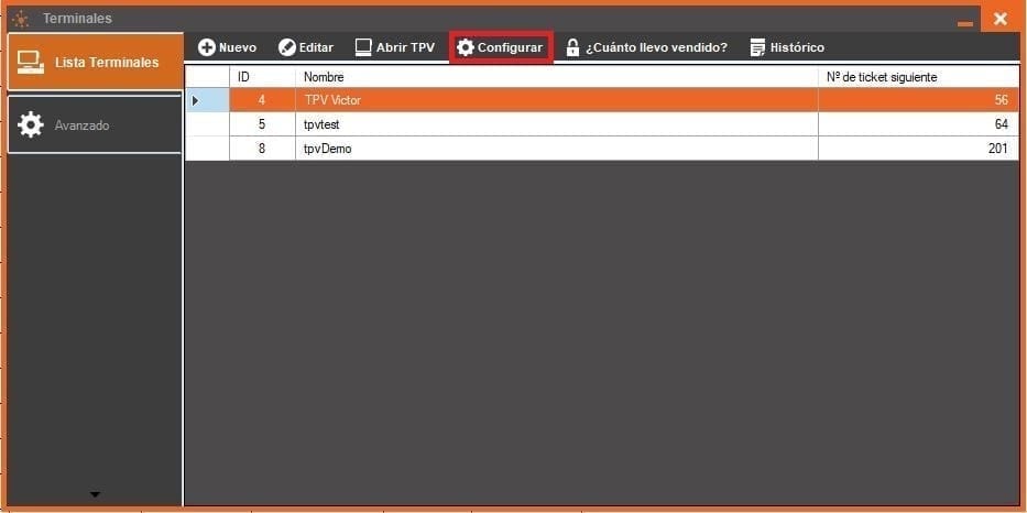 Para ello en nuestra ventana de selección de TPV seleccionamos el TPV que deseamos configurar y seleccionamos la opción “configurar”(Marcado con un recuadro Rojo)