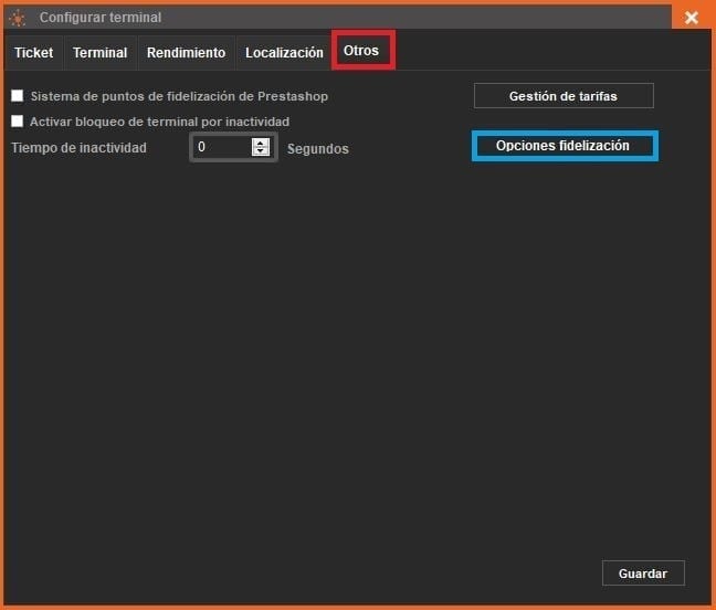 En el menú “Otros” (Remarcado con un recuadro Rojo) selleccionaremos “Opciones de fidelización” (Remarcado con un recuadro Azul).