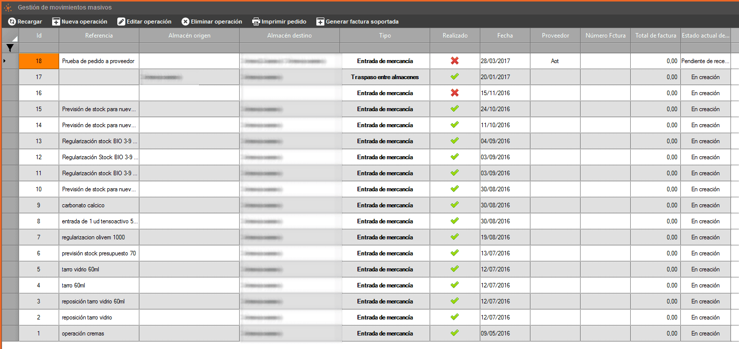 En primer lugar hay que destacar que las operaciones tienen dos estados básicos de gestión, además de sus estados internos. Una operación puede estar “realizada” (aspa verde), que indica que el stock de esa operación ya se inserto, se sacó o se traspasó y lo único que podremos ya hacer con esas operaciones es revisarlas o imprimir un documento, no será posible editarlas salvo ciertos campos muy concretos.