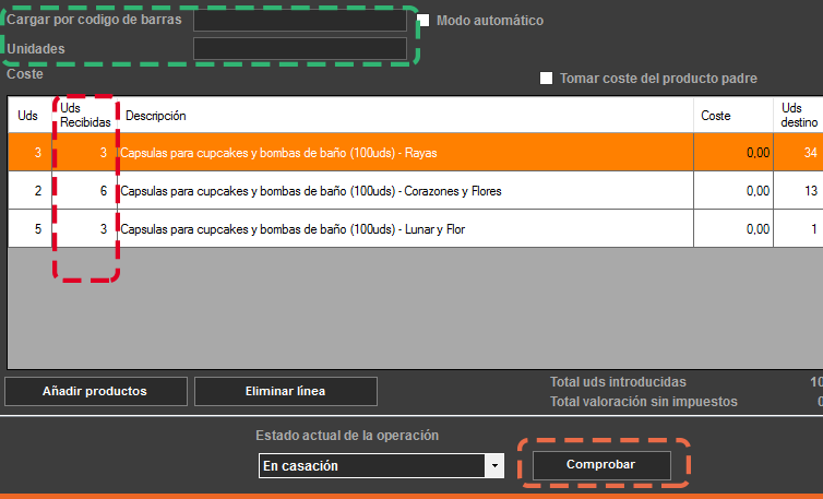 Cuando la operación está en modo “casación”, lo que introduzcamos por el cuadro de “cargar por código de barras” pasará a copmrobarse en la lista de productos pedidos, así como sus unidades. Si picamos algo que no está seremos avisados. También podemos meter manualmente las unidades recibidas en la columna “uds recibidas”, cuando terminemos de repasar los productos que hemos recibidos, podemos hacer click en “comprobar” para ser avisados de si hay o no algo que revisar en la introducción de la mercancía.