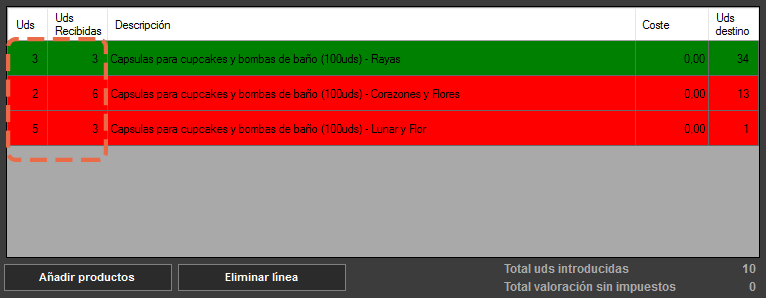La casación nos alerta mediante colores aquellas líneas que están correctas (verde) y las que no (rojas). Y las que se quedan blancas es porque no se ha procedido a leerlas o a introducir mercancía recibida (puede ser que no haya venido por falta de stock en el proveedor por ejemplo).
